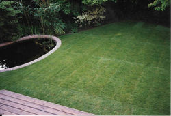 gleichmäßiges Aufbringen der Rasensamen, einrechen, Fläche abwalzen und bewässern
